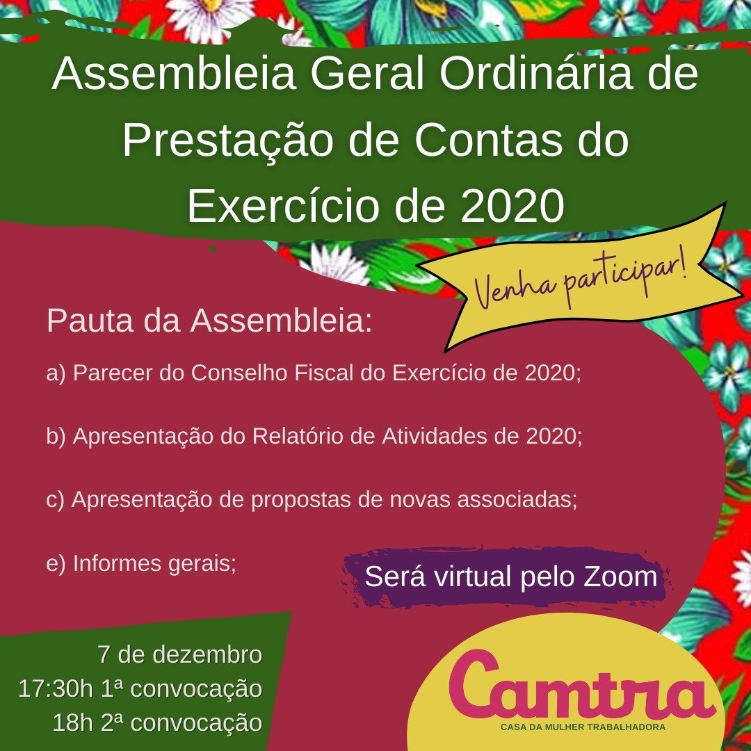 EDITAL CONVOCAÇÃO DA ASSEMBLEIA ORDINÁRIA DE PRESTAÇÃO DE CONTAS DO EXERCÍCIO DE 2020 DA CASA DA MULHER TRABALHADORA (CAMTRA). A Casa da …