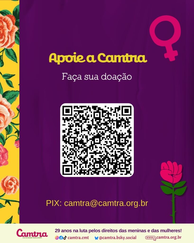 #ParaTodasVerem Card com fundo roxo texturizado, com símbolo da Vênus com a rosa da Camtra no canto superior esquerdo, ao lado de um banner verde com a inscrição “Camtra Indica”. No canto superior direito, em um banner magenta, está escrito: “Edição especial de aniversário”. Logo abaixo, no canto esquerdo, lê-se: “Revista Trabalho, Tempo e Vidas das Mulheres – Camtra – 2009”. No lado direito, está capa de revista em uma moldura branca com balões de aniversário cor de rosa. Abaixo, centralizado, há um QR Code com o convite “Apoie a Camtra – Faça sua doação! PIX: camtra@camtra.org.br”. Abaixo, sobre uma faixa clara, está o logotipo da Camtra com a frase: “29 anos na luta pelos direitos das meninas e das mulheres!” seguida dos ícones das redes sociais e a página na internet da organização.
